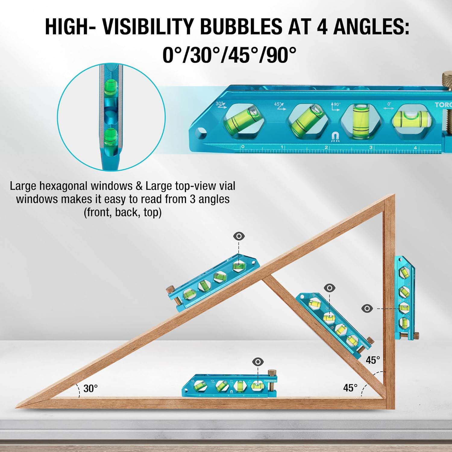 Tilstedeværelsen av høye synlighetsbobler i 4 vinkler (0 °/30 °/45 °/90 °) er en stor fordel. Disse boblene er tydelig synlige fra forskjellige orienteringer, noe som betyr at om vi foretar målinger i standard horisontale eller vertikale vinkler eller i spesifikke skrå vinkler som 30 ° eller 45 °, kan vi få nøyaktige avlesninger. Denne multi -vinkelboblefunksjonen forbedrer allsidigheten på nivået betydelig. Nøyaktigheten av lesingen forbedres fordi boblene er nøyaktig kalibrert. For eksempel, når du måler tilbøyeligheten til en skrånende overflate i en vinkel på 45 °, kan boblens posisjon gi oss en svært nøyaktig indikasjon på vinkelen, med en feilhastighet så lav som 0,05 ° sammenlignet med nivåer med mindre nøyaktig boble kalibrering.