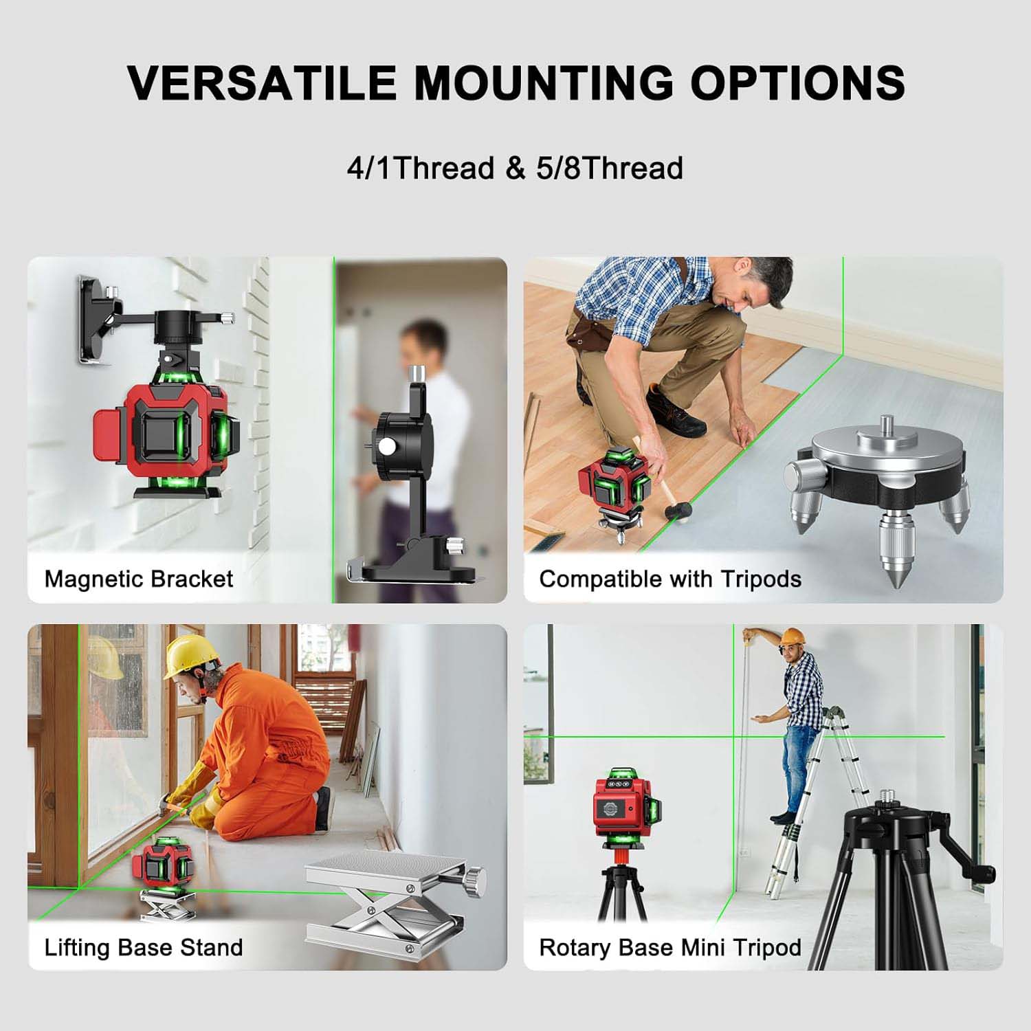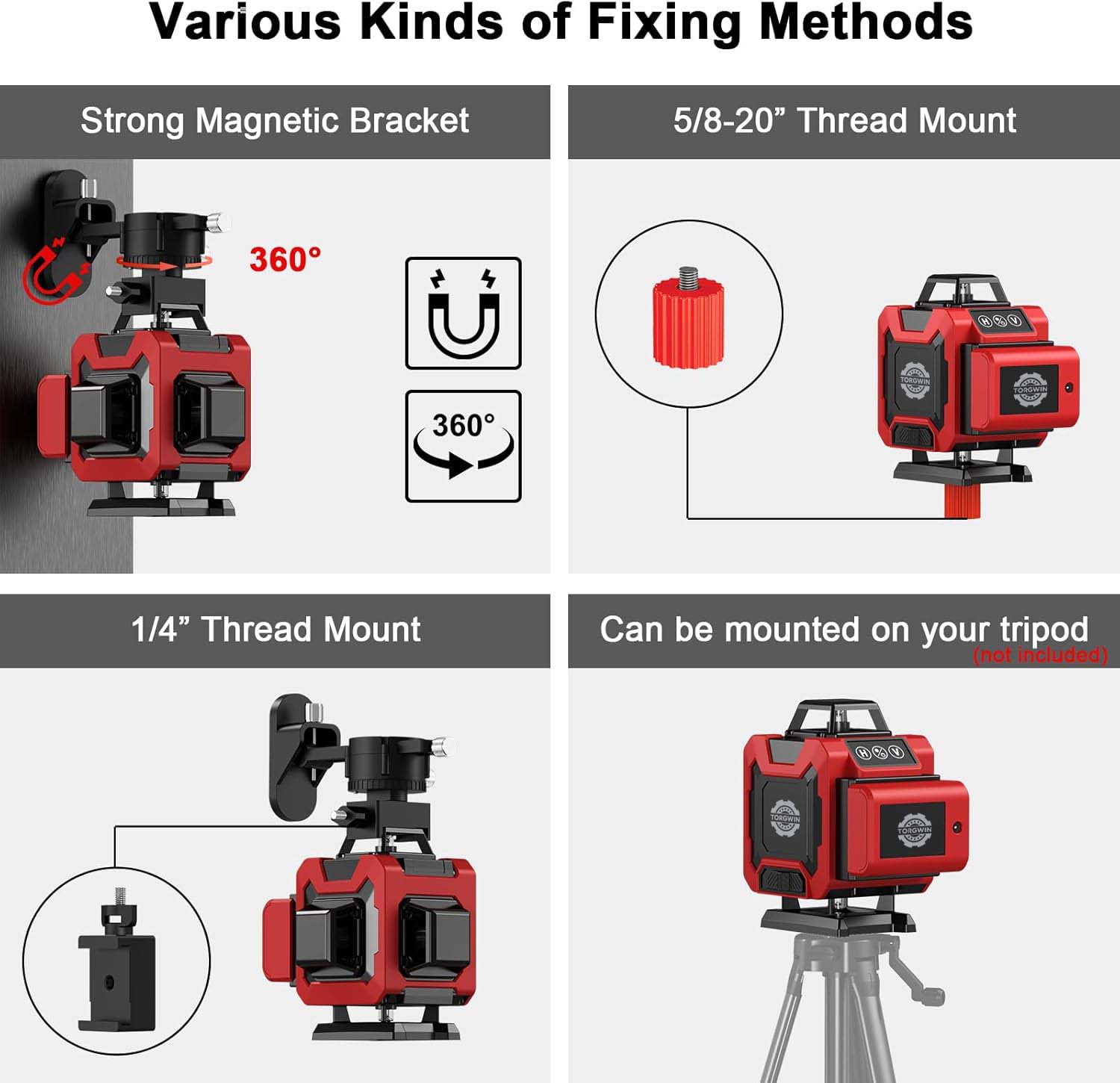 1. Ulike festemetoder:Den er utstyrt med en sterk magnetisk brakett, som gir en stabil og praktisk måte å fikse lasernivået på i mange situasjoner. 5/8 - 20" gjengefestet gir mulighet for tilkobling til spesifikke enheter eller strukturer med denne typen gjenger. 1/4" gjengefestet tilbyr også et annet alternativ for montering, noe som øker kompatibiliteten med forskjellig tilbehør.